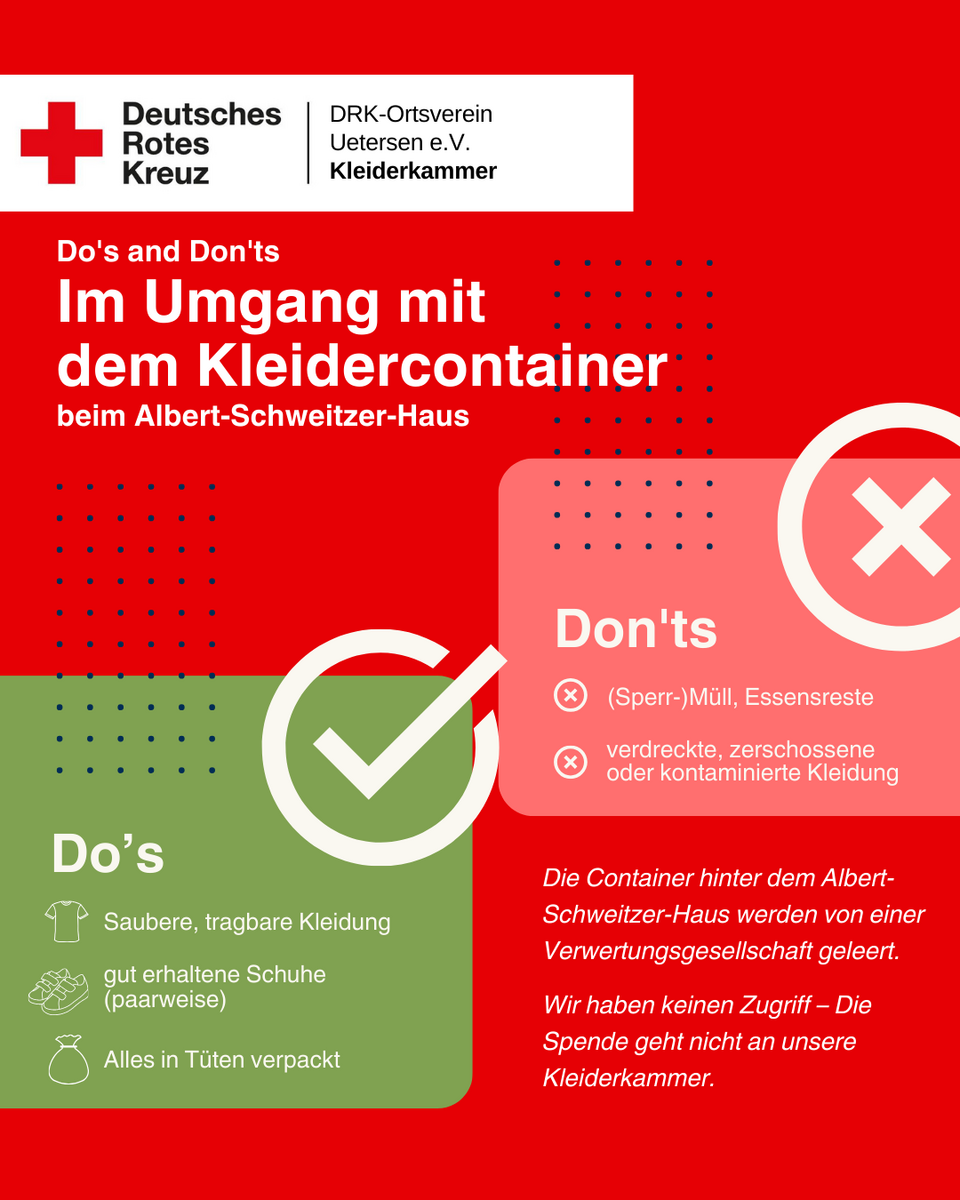 Altkleider gehören nicht in den Müll – denn Altkleider helfen zu helfen. Jeder Deutsche kauft pro Jahr rund 12 kg neue, modische Kleidung. Doch wohin mit der alten Kleidung? Ein Teil der gut erhaltenen Kleiderspenden geht in die Kleiderkammern des DRK. Dort wird die Kleidung sortiert, aufbereitet und weitergegeben.